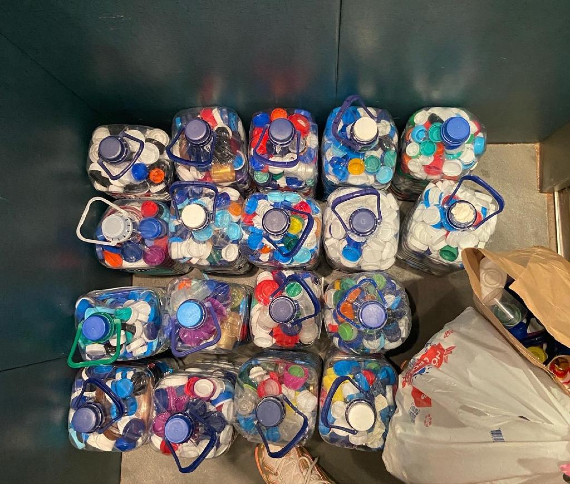 O Leo Clube de Vila Nova de Famalicão contribuiu com 15 garrafões de tampinhas e alguns sacos de material do ecoponto amarelo (plásticos) para apoio ao projeto Um Sorriso para a Leonor.