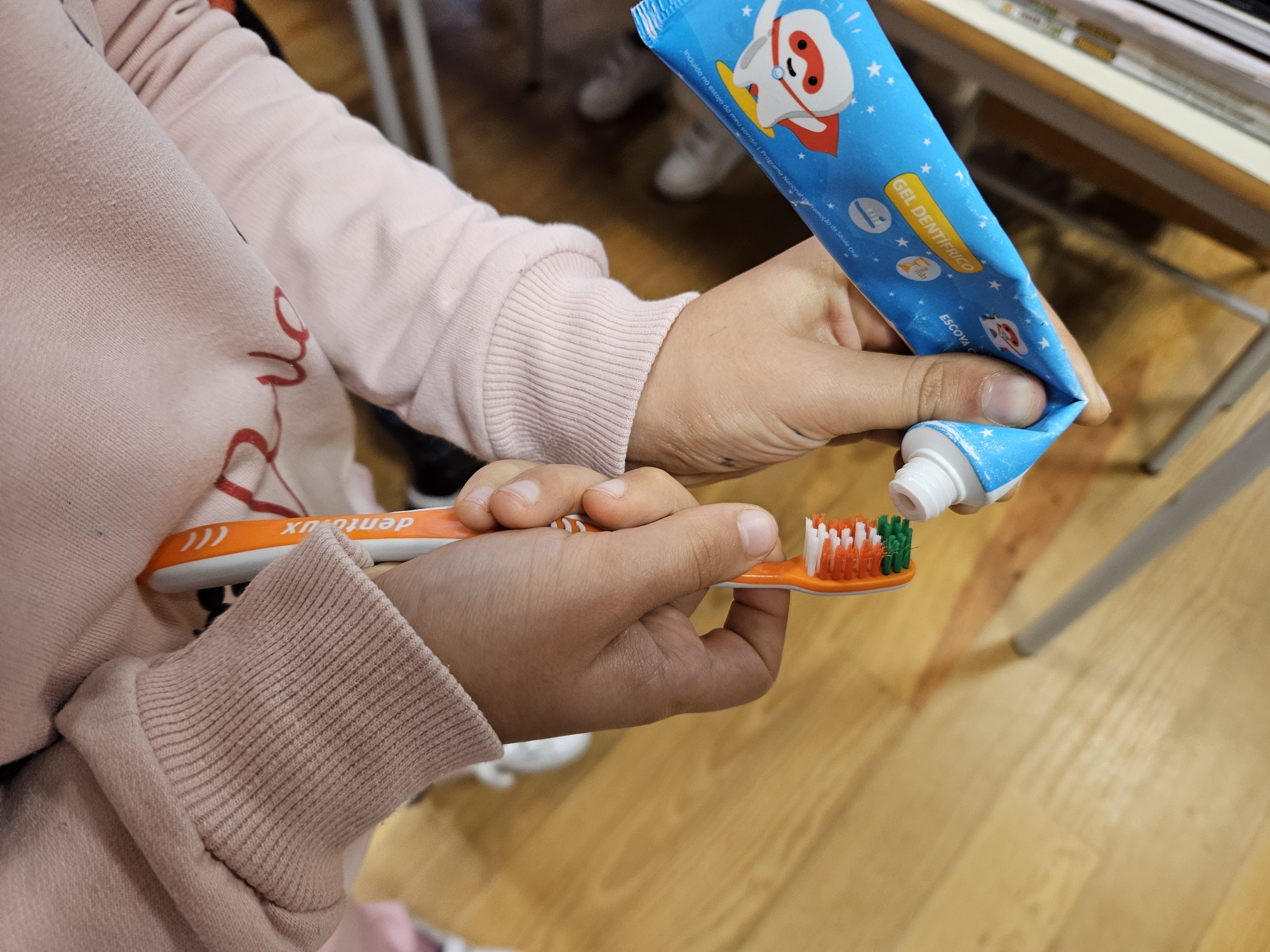 Para que todos vissem e entendessem a mensagem principal - cuidar da saúde oral - a enfermeira fez-se acompanhar de uma dentadura e uma escova gigantes. Mostrou como deve ser feita a escovagem e porque deve ser feita dessa maneira. Alertou para a importância de uma pasta com a quantidade de flúor recomendada e para o tamanho da escova, que depende da dimensão da boca. “Deve ser preferencialmente pequena para não magoar as gengivas”, esclareceu.