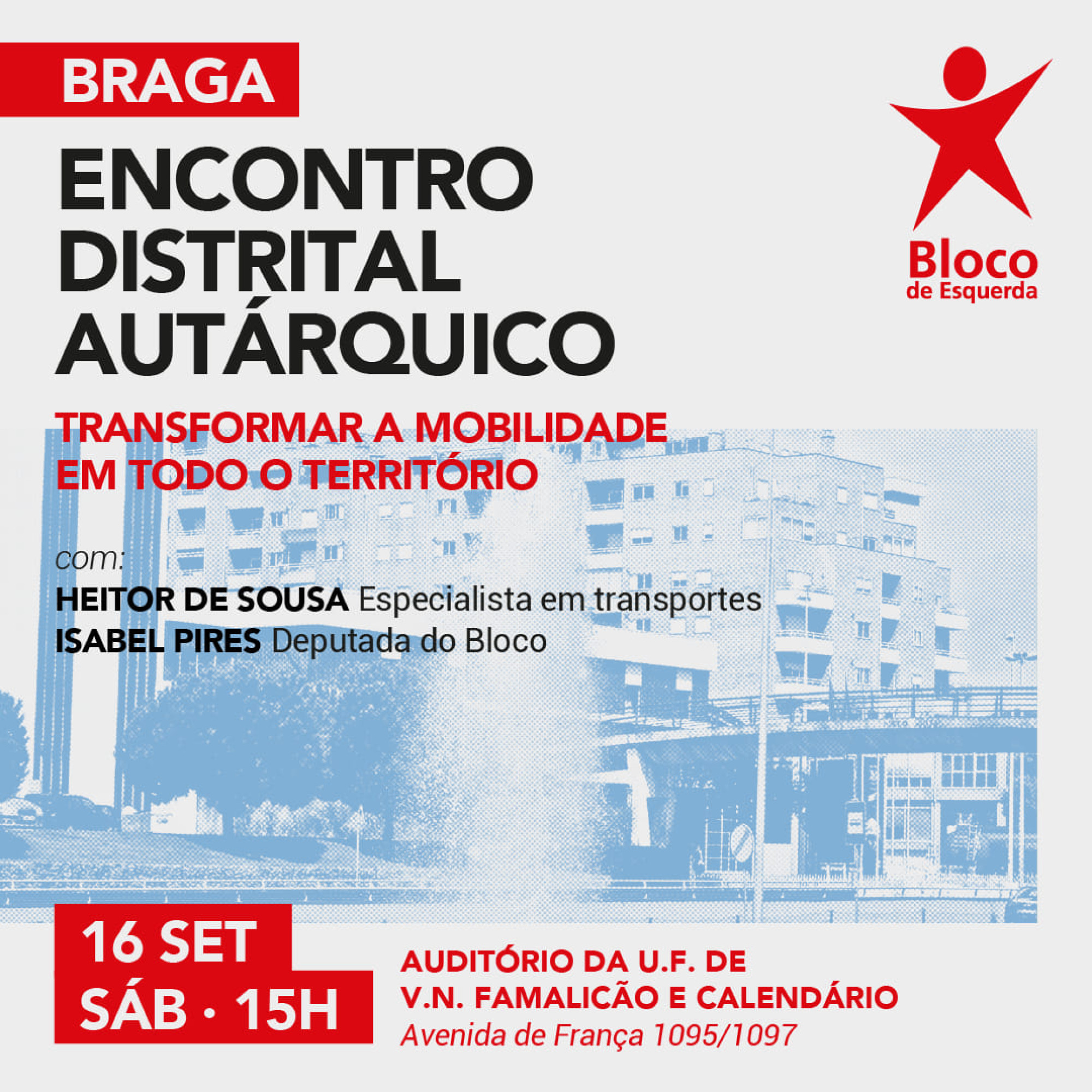 A Comissão Coordenadora do Bloco de Esquerda de Braga organiza no próximo sábado, dia 16 de setembro, às 15 horas, no auditório da união de freguesias de Famalicão e Calendário, o encontro distrital autárquico.