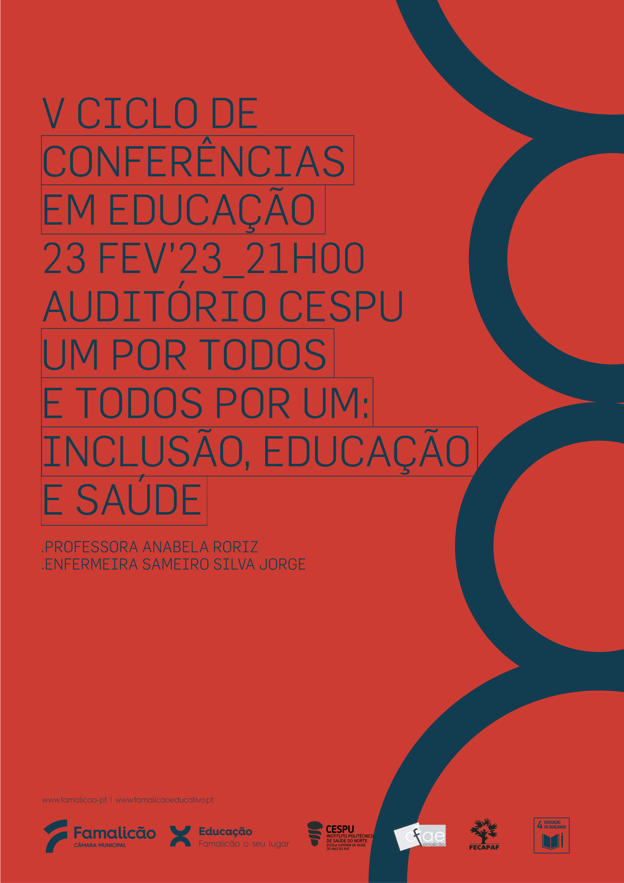 A Câmara Municipal de Vila Nova de Famalicão vai promover no próximo dia 23 de fevereiro, um novo encontro do Ciclo de Conferências em Educação, desta vez subordinado ao tema ‘Um Por Todos, Todos Por Um: Inclusão, Educação e Saúde’. A sessão vai acontecer no auditório da CESPU - Cooperativa de Ensino Superior Politécnico e Universitário, pelas 21h00, e tem como convidadas a professora Anabela Roriz e a enfermeira Sameiro Silva Jorge.
