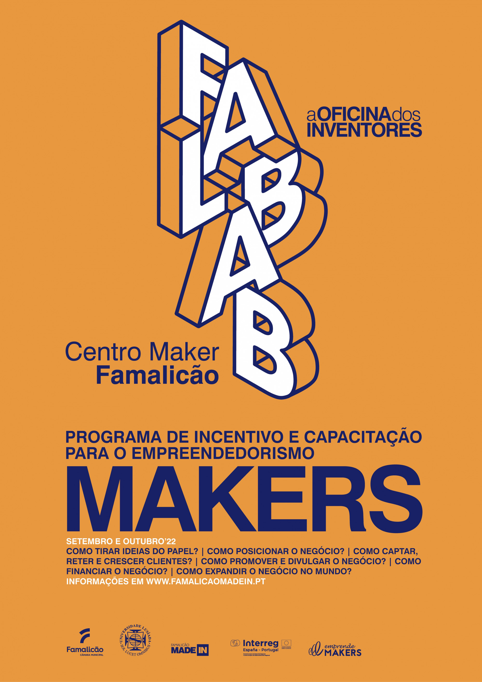 Nos meses de setembro e outubro vai realizar-se o programa Makers, iniciativa de apoio ao empreendedorismo e a criação de novos negócios no concelho de Vila Nova de Famalicão, que tem como objetivo capacitar promotores com ideias de negócio nas áreas do empreendedorismo, financiamento e internacionalização, com base em ferramentas de trabalho de gestão empresarial, gestão estratégica, gestão de pessoas, marketing, finanças, entre outros.