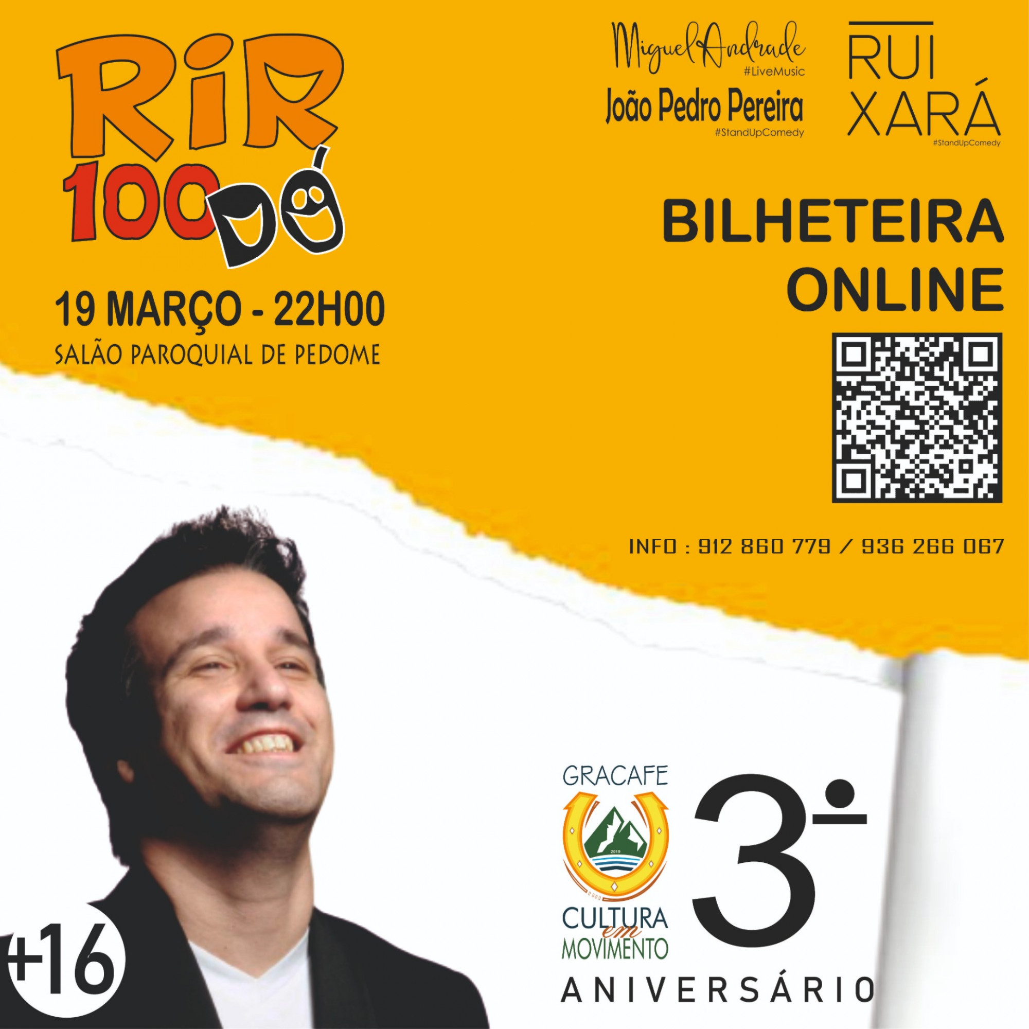 A Grupo Recreativo Amigos de Calça Ferros (GRACAFE), de Pedome, promove, no próximo dia 19 de março, em que se assinala o Dia do Pai, a primeira edição do evento “Rir 100 Dó”, que também coincide com a celebração do nosso 3.º aniversário como associação. O protagonista é um dos pioneiros no Stand Up Comedy em Portugal, Rui Xará.