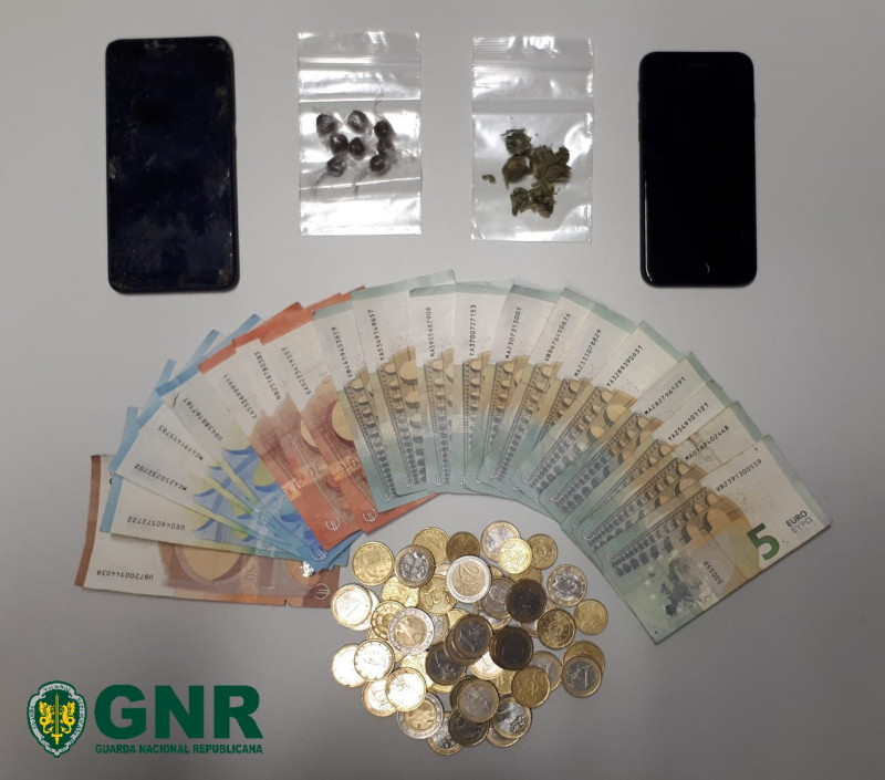 Nas buscas domiciliárias foram apreendidas seis doses de haxixe, três doses de folhas de canábis, dois telemóveis e mais de 259 euros em dinheiro.