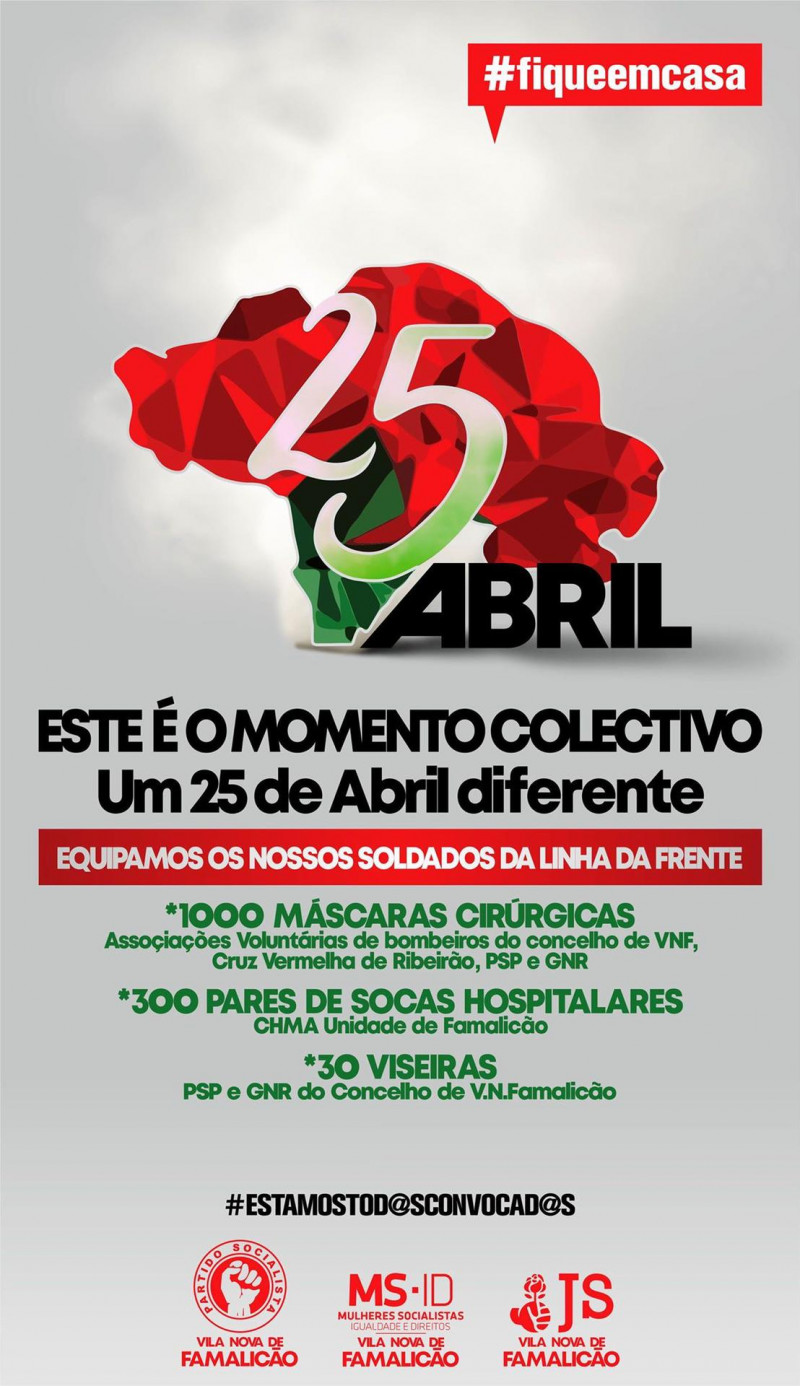 O PS de Vila Famalicão entregou socas hospitalares, máscaras cirúrgicas e viseiras de protecção individual ao Hospital de Famalicão, às três corporações de bombeiros, à Cruz Vermelha de Ribeirão, à PSP e à GNR do concelho. A acção surge enquadrada nas comemorações do 46.º aniversário do 25 de Abril, que se assianala hoje.
