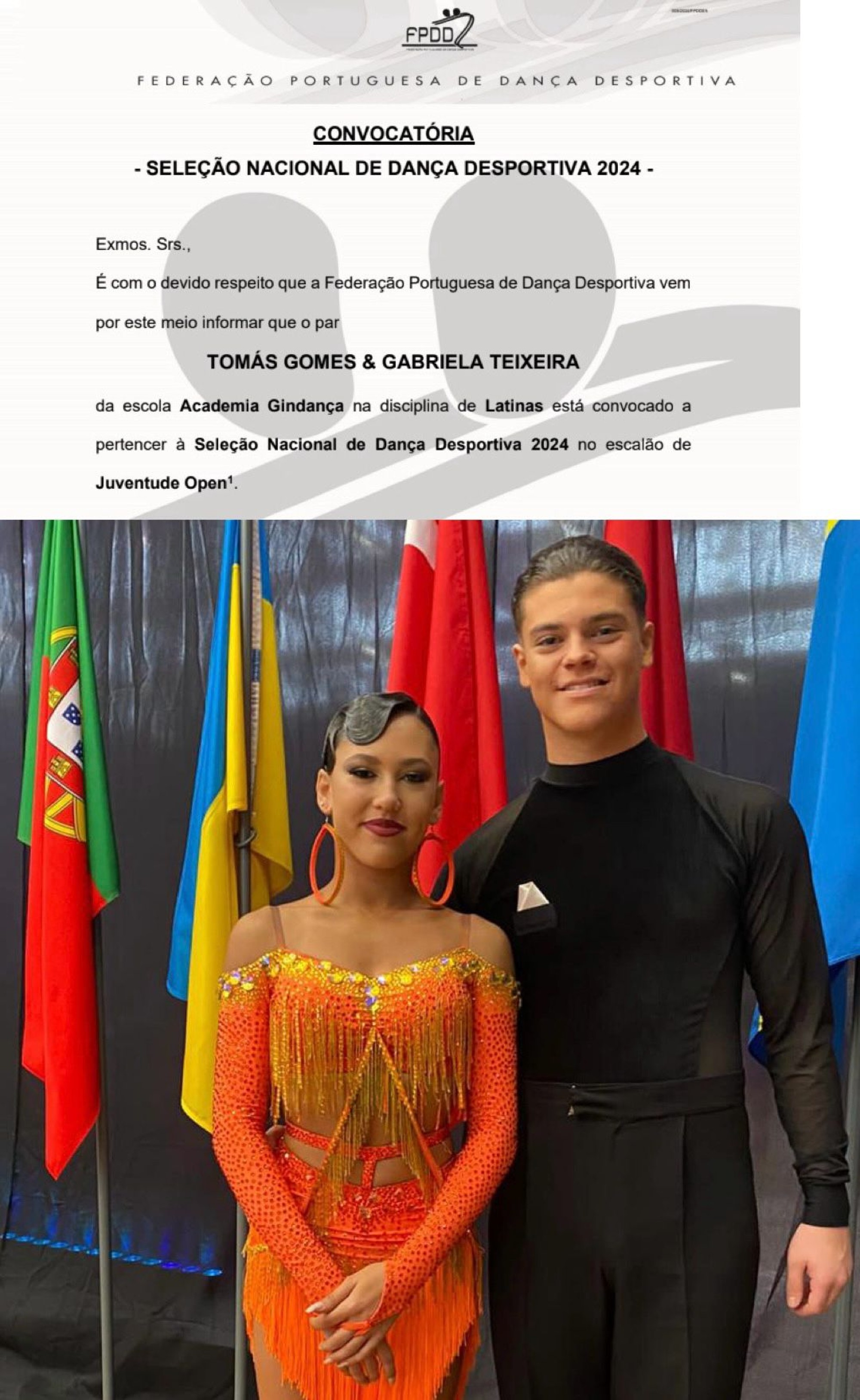 Mais uma vez o par famalicense Tomás Gomes & Gabriela Teixeira da Academia Gindança faz parte da convocatória da Federação Portuguesa de Dança desportiva para a Seleção Nacional de Dança Desportiva da época 2024.